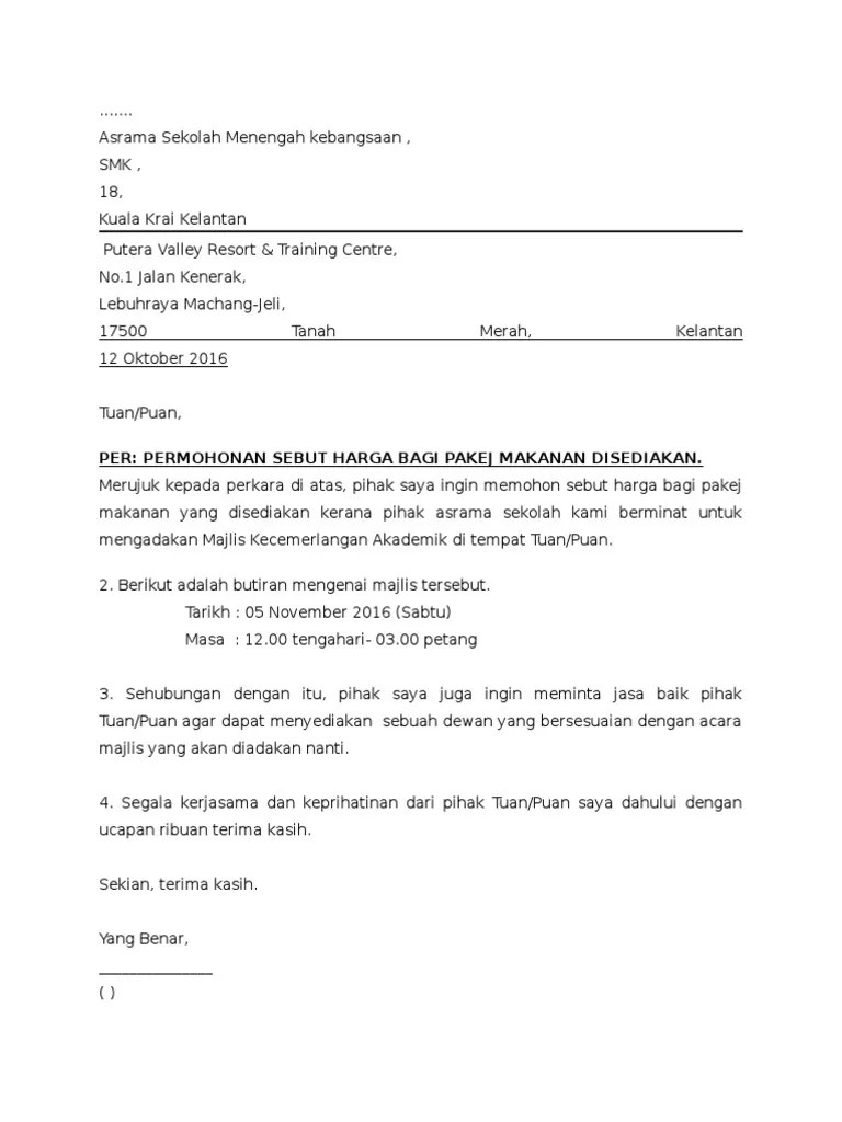 Contextual translation of contoh surat sebut harga into english. Surat hibah harta bisa disebut sebagai surat pernyataan, dimana seseorang menyatakan sudah bukan hanya tanah dan rumah saja yang bisa dihibahkan. Surat kesanggupan adalah surat berharga yang memuat kata aksep atau promes. Tatacara membuka sebut harga langkah 1 ajk pembuka sebut harga hendaklah menandatangani dan cop jawatan pada muka surat belakang sampul surat penender dan tuliskan tarikh. Contoh contoh karangan sekolah rendah surat kiriman rasmi via newhairstylesformen2014.com.
